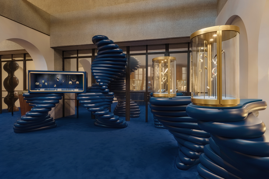 展厅灵感源自 20 世纪 60 至 70 年代。PIAGET 伯爵以标志性的蓝色与金色色调,构筑出一处沉浸式艺术空间。高级珠宝与腕表臻品与空间美学融为一体,将参观者带回那个深刻影响设计与艺术的鎏金岁月,全方位呈现 PIAGET 伯爵作为制表与珠宝大师的非凡造诣。